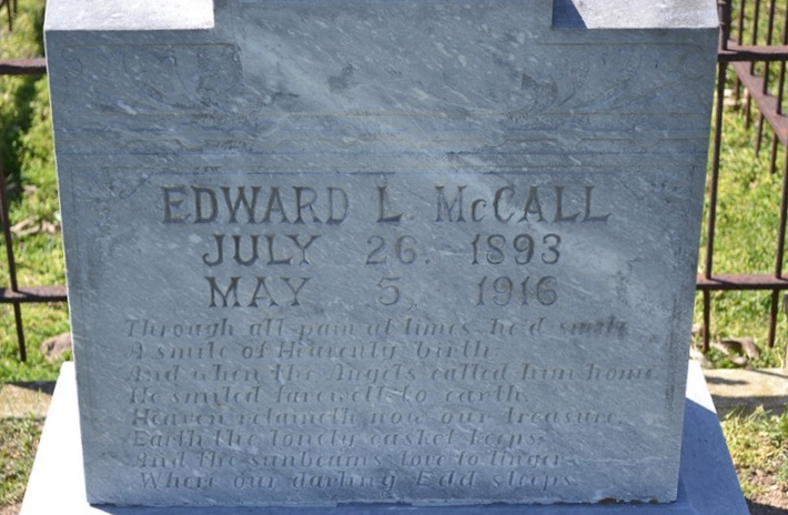 She was a true daughter of the South. She was born in Tupelo, Mississippi on February 25, 1870. Her parents were Mr. and Mrs. T. H. Freeman, who brought their family to live in Texas in 1880. Their daughter, Miss Bessie Freeman, taught school in Milam County. She married E. J. McCall in 1892 and their home has been a center of hospitality since it was established. They resided in Cameron for several years and Mrs. McCall made a host of friends here. The family have resided in Yarrellton for several years. Mrs. McCall is survived by her husband and four daughters; Mrs. J. C. Perkins, Marion, Jessie, Mrs. E. D. George, one sister, Mrs. Annie F. Taylor of Laredo, and one brother, T. H. Freeman of Rosebud. She died April 19, 1938. Her funeral was held in the Baptist church in Yarrellton by Rev. O. C. Acrey on Thursday afternoon. Many and beautiful floral tributes were sent. Interment was in North Elm Cemetery.