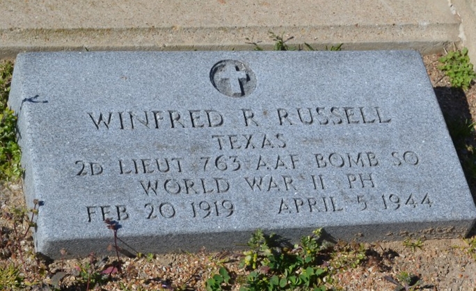 - Remarks: WINFRED R. RUSSELL NOW LIEUTENANT IN AIR CORPS; GETS HIS WINGS Moody Field, Ga., August 11.â€â€Former Aviation Cadet Winfred R. Russell, son of Mr. and Mrs. C. E. Russell of Cameron, has been graduated from the Army Air Forces Advanced Flying School at Moody Field, Ga., and commissioned a second lieutenant with the rating of army pilot. Col. H. F. Muenter, commanding officer of Moody Field, presented their “wingsÃ¢â‚¬ï† to the class at the graduation ceremonies in the Post Theatre. The graduates and a large audience of families and friends of the new pilots heard a valedictory address by Lt. George B. Boone of Douglaston, Long Island, a member of the class. Lt. Boone reviewed the long months of training through which he and his classmates had struggled to get their commissions. The arduous routine of pre-flight, primary, basic and advanced training was behind them, he said, and now they were prepared to turn their acquired flying skill against the Axis. He commented wryly and with humor on some of the regulations and restrictions placed on all aviation cadets during their training but admitted that they were all essential to the creation of an Army flier. Nat. B. Wofford of Port Arthur, will arrive Saturday night to spend Sunday and Labor Day with his mother, Mrs. Hallie Jones Wofford. Nat was reared in Cameron and has many friends here who will be glad to welcome his visit to Cameron. The Cameron Herald, 16 Sep 1943 MISSING AIR CREW REPORT WINFRED R. RUSSELL 15th AF, 460th Bomb Group, 763rd Bomb Squadron Date: 5 Apr 1944 Altamura, Italy Plane collided with another plane in mid-air, the planes exploded upon colliding and there were no survivors of either plane 2nd Lt. Winfred R. Russell, 0-808469 was the pilot of the plane Next of Kin: Mrs. Lena M. Russell (Mother), c/o Charlie Russell, Catholic Hospital, Abilene, Texas 8500