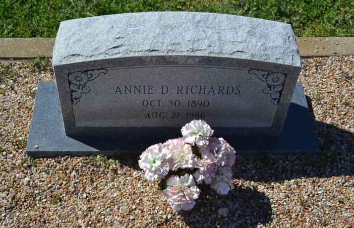 MRS. RICHARDS DIES; SERVICES Mrs. Annie D. Richards, 75, a long-time resident of Milam County, died at 8:30 a. m. Sunday in a Cameron hospital. She is survived by two daughters, Mrs. Josephine Leonard, 302 S. College, Cameron and Mrs. Earl McFarland, Temple; one brother, John Dabbs, Houston; three grandchildren, Thomas Leonard, USAF Puerto Rico, Douglas McFarland, and Miss Charlotte McFarland, both of Temple. Funeral services were held at 4 p. m. Tuesday in the Chapel of Greens Funeral Home in Cameron, Rev. James E. Lafferty officiating. Interment was a North Elm Cemetery. The Cameron Herald, 25 Aug 1966