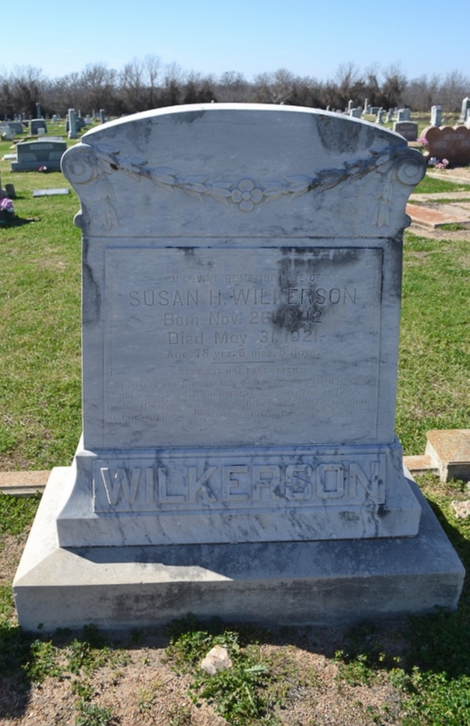 Mrs. S. H. Edwards [Wilkerson] Dead At 79 Years Pioneer Woman Dies in Yarrellton Home Tuesday After Short Illness Mrs. H. Edwards aged 79 years, pioneer resident of Milam County, died at her home in Yarrellton Tuesday morning at 9:45 oclock after a short illness. Mrs. Edwards was born in Kentucky, November 26, 1842. She was married to William H. Wilkerson in 1860. They were among the pioneers settlers in this county. She had resided for 49 years in Yarrellton. Funeral was held from the residence Wednesday with C. N. Green and Brothers directors. Rev. S. B. Culpepper conducted the services. Deceased was a member of the Baptist church. She is survived by eight children as follows: Jim Wilkerson, Temple; Ance Wilkerson, Cameron; Dave and Isaac Wilkerson of Yarrellton; Mrs. Maude Davis of Plainview; Darcus Wilkerson, Yarrellton; Mrs. Geneva Lankford, Mrs. Massey Harris, Ballinger. Interment was made in North Elm Cemetery at 3:30 oclock Wednesday afternoon. The Cameron Herald, 02 Jun 1921