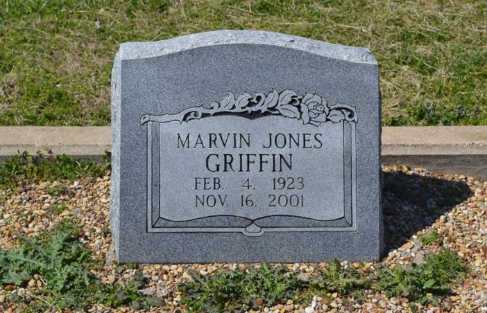 MARVIN JONES GRIFFIN Marvin Jones Griffin, 78, of Alvarado and formerly of Milam County, died of cancer Nov. 16 at a Cleburne nursing home. The Rev. Chuck Barnard officiated at a memorial service Nov. 20 in Cleburn. Burial followed in the North Elm Cemetery near Cameron. Griffin was born Feb. 4, 1923, near Cameron. He graduated from Buckholts High School and farmed with his mother and father. After his fathers death, he and his mother moved to Arlington and lived there for several years. He worked for the Arlington school district as a custodian before retiring to Alvarado. He was a member of the Greenbriar Baptist Church. He is survived by his brother Zack Griffin of Alvarado and several nieces and nephews. If desired, memorials may be given to hospice or to Greenbriar Baptist Church. Cameron Herald, 22 Nov 2001