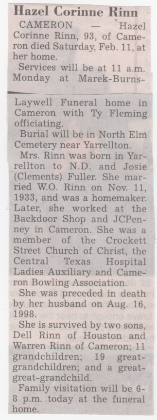 HAZEL CORINNE RINN Hazel Corinne Rinn, 93, of Cameron died Feb. 11 at her home. Funeral services were held Feb. 13 at Marek-Burns-Laywell Funeral Home in Cameron with Ty Fleming officiating. Burial followed in the North Elm Cemetery near Yarrellton. Rinn, a homemaker, was born July 31, 1912 in Yarrellton to N.D. and Josie (Clements) Fuller. She married W. O. Rinn Nov. 11, 1933 and he preceded her in death. She worked at the Backdoor Shop and J. C. Penney in Cameron. She was a member of the Crockett Street Church of Christ, the Central Texas Hospital Ladies Auxiliary and the Cameron Bowling Association. Survivors include sons, Dell Rinn and wife, Shirley, of Houston and Warren Rinn and wife, Mary Ann, of Cameron; 11 grandchildren; 19 great-grandchildren and one great-great-grandchild. The Cameron Herald, 16 Feb 2006